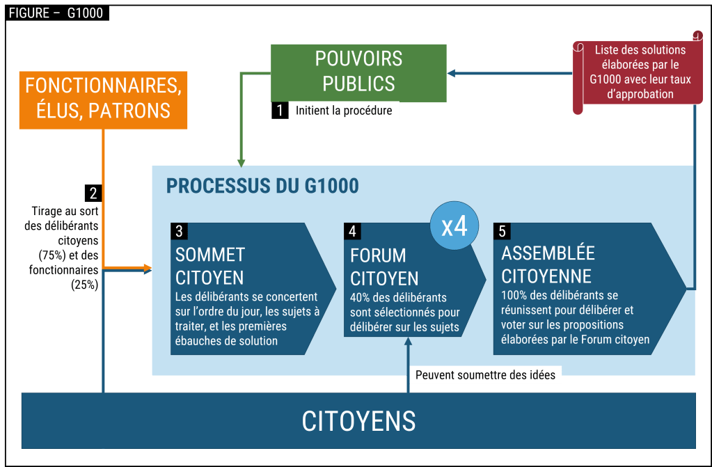 L’originalité du G1000 réside dans son phasage : l’ensemble des délibérants tirés au sort se réunissent pendant une journée afin de définir le périmètre au sein duquel les sujets doivent être traités, un maximum de questions, de problématiques, de solutions et d’idées sont alors remontées pendant ce « Sommet citoyen ». Puis, une fraction des délibérants sont sélectionnés afin de constituer des petits groupes d’étude qui vont s’emparer de ces sujets, s’en instruire, et délibérer ; ce travail a lieu sur plusieurs sessions espacées (4 en moyenne). Enfin l’ensemble des délibérants se réunit à nouveau afin de voter les propositions élaborées par les groupes du « Forum citoyen ».