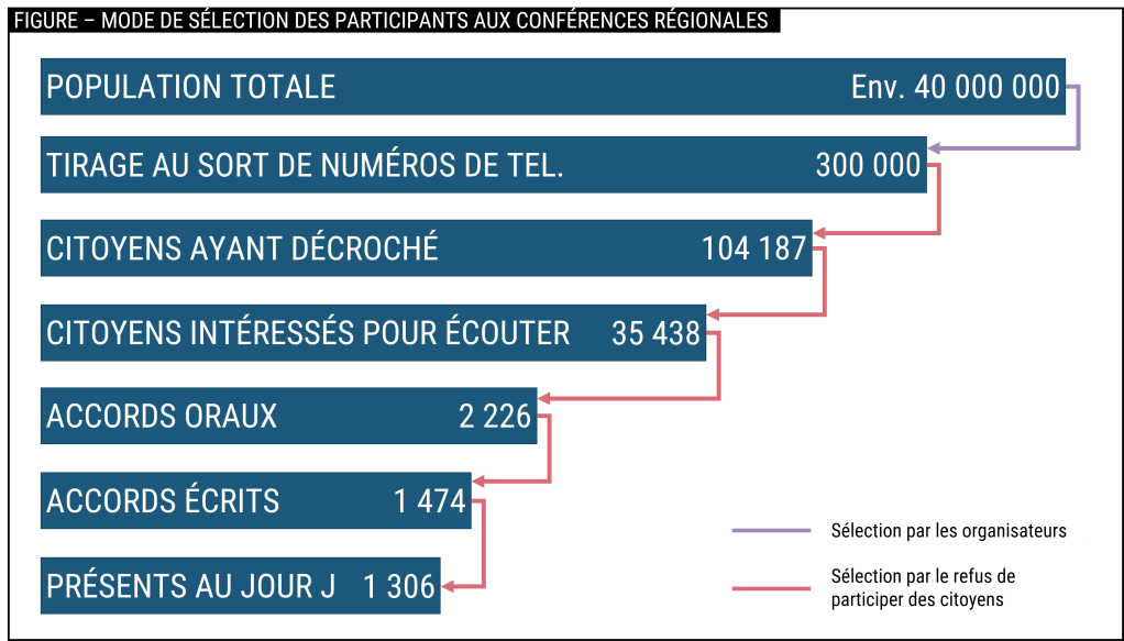 Les citoyens participant aux conférences ont été choisis suivant un tirage au sort à deux tours. Toutefois, en raison du faible taux de réponse, le second tour ne fut pas nécessaire :