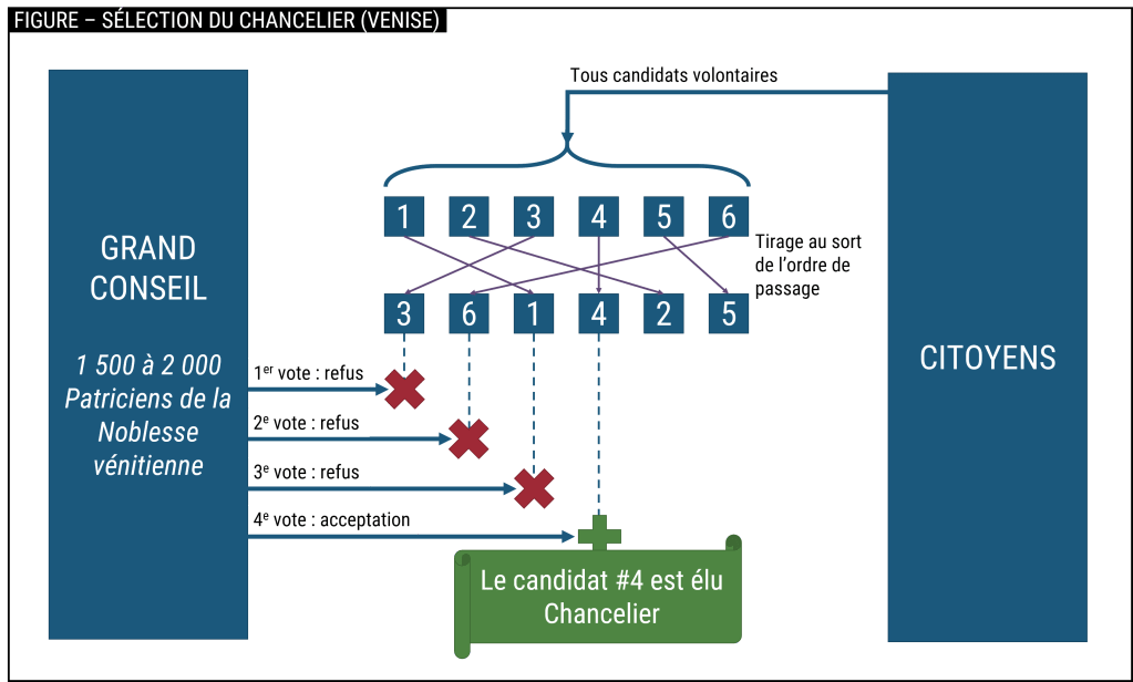 Le sort détermine l’ordre dans lequel les candidats sont présentés au Grand Conseil, puis celui-ci se prononce sur chacun d’entre eux jusqu’à ce qu’un citoyen obtienne la majorité et soit élu Chancelier. Cette méthode mêle habilement tirage au sort et élection : le tirage au sort permet à des candidats non préférentiels de passer en premier lieu (et donc éventuellement d’être élu à la place de candidats plus populaires), et l’élection permet de garantir qu’au minimum 50% des patriciens sont favorables au candidat.