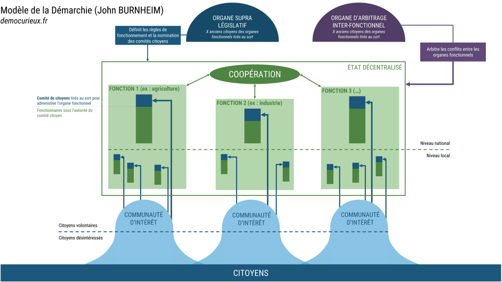Voici un schéma synthétique qui permet de représenter les principes de la démarchie à une échelle nationale :