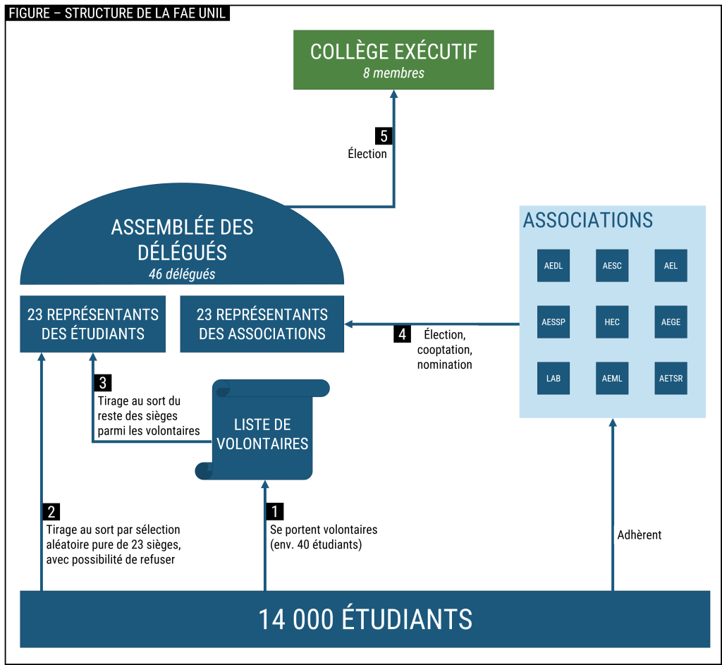 Dans la configuration de la FAE, rien n’empêche les étudiants de suivre un cursus honorum car, ils peuvent soit se porter volontaire à l’Assemblée des délégués (avec une chance de 50% d’être tiré au sort), soit se faire désigner par une association membre de la fédération (selon leur habilité politique et charismatique). En outre, une fois leur mandat législatif écoulé, ils peuvent se présenter afin d’être élu au Collège exécutif de la FAE, apogée de leur carrière estudiantine qui pourra se poursuivre dans le champ de la politique locale, puis cantonale, puis confédérale.