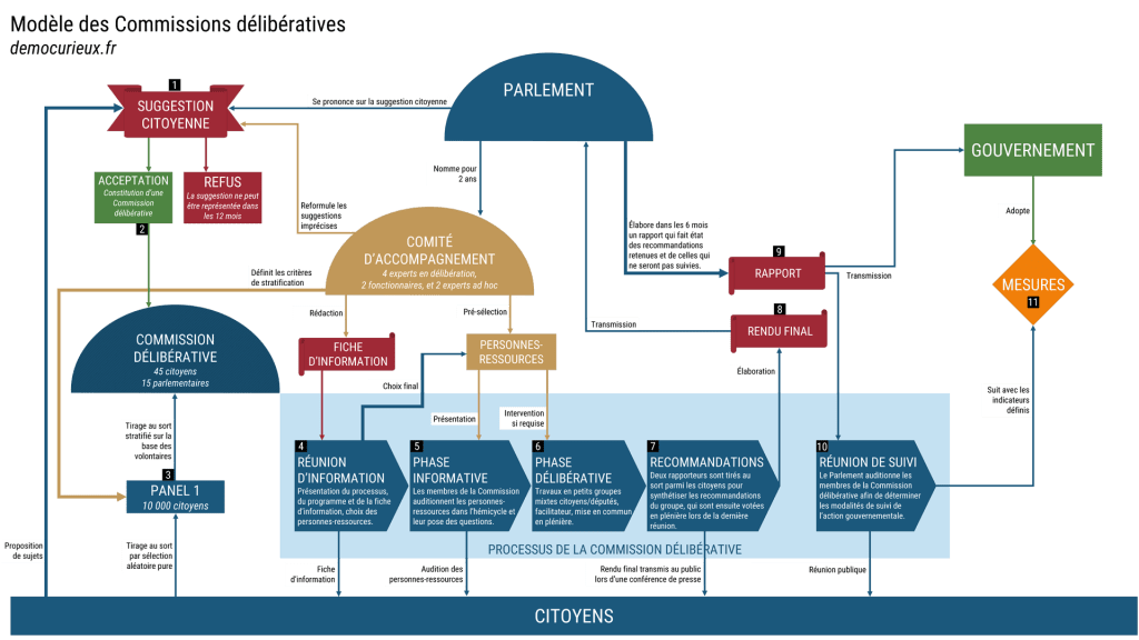 - À l’issue de ce rapport, la commission parlementaire auditionne les citoyens qui étaient membre de la Commission délibérative afin de discuter des modalités de suivi des recommandations retenues. Cet échange est public et relayé par les médias.