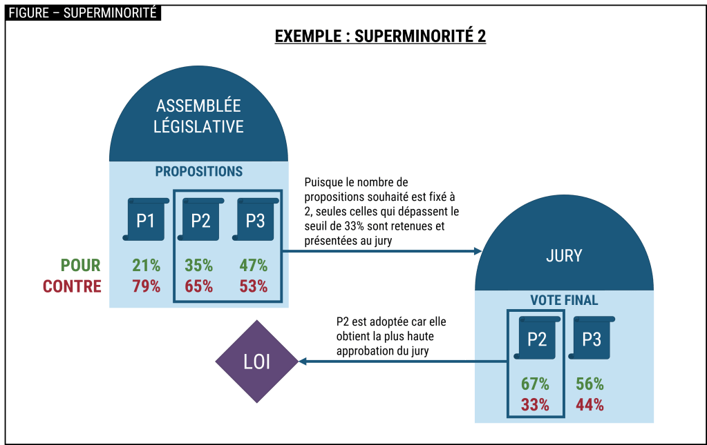 Classiquement, une assemblée législative a deux rôles : concevoir les lois d’une part et les adopter d’autre part. Dans le cadre de la superminorité, on considère que ces fonctions doivent être nettement séparées : une institution s’occupe de l’élaboration des lois (l’Assemblée) tandis qu’une autre est chargée de les adopter (le Jury).