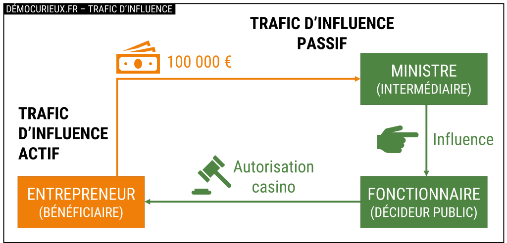 Ce délit est une version plus élaborée de la corruption. Le bénéficiaire verse de l’argent à un intermédiaire pour que celui-ci exerce son influence sur un décideur public.