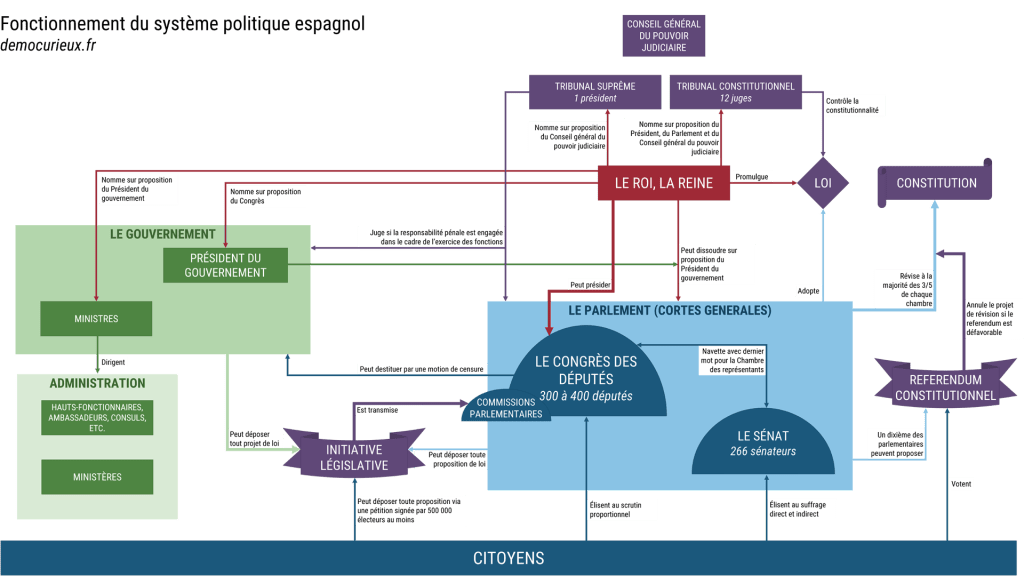 L’Espagne est une monarchie constitutionnelle organisée sous la forme d’un régime parlementaire. Contrairement au Roi de Suède, le monarque espagnol a conservé quelques pouvoirs politiques.