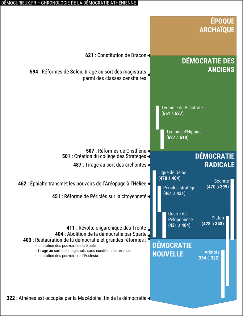 La démocratie athénienne s’étend sur près de deux siècles, mais il serait faux de penser qu’il s’agit d’un régime continu : la démocratie de l’époque de Clisthène est sensiblement différente de celle de l’époque de Démosthène. D’où l’intérêt de retracer les évolutions du régime athénien dans une chronologie politique.