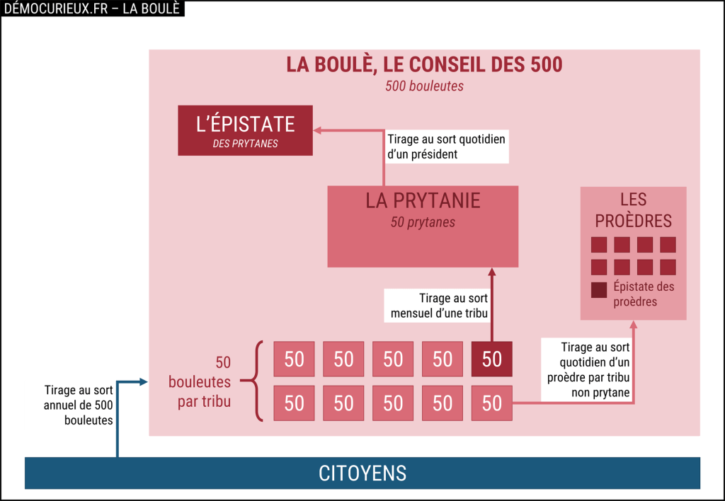 Les 500 membres de la Boulè, les bouleutes, sont tirés au sort parmi les 139 dèmes (villages ou quartiers) de l’Attique. Les dèmes ont un nombre de sièges au Conseil qui dépend de leur taille. De plus, chacune des dix tribus (grandes circonscriptions) est représentée par 50 bouleutes.