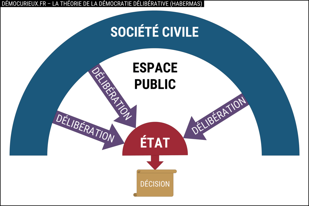 Pour Habermas, la délibération est un phénomène qui part de la périphérie de l’espace public vers son centre, avec, à chaque étape, un débat libre et équitable où tous les citoyens concernés peuvent participer. Seules les décisions prises en vertu de ce principe peuvent ainsi être qualifiées de légitimes.
