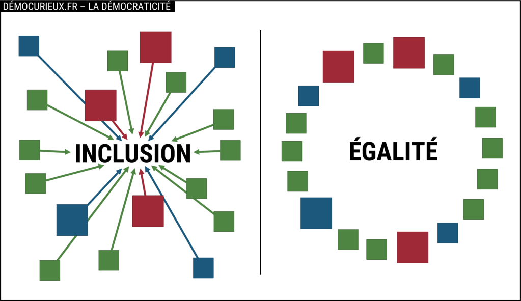 Ces deux principes s’imposent d’eux-même quand on cherche à prendre une décision de manière démocratique dans un groupe de quelques individus. On s’assure d’inviter tous les membres du groupe dans la discussion (inclusion), tout en donnant le même droit de parole à chaque personne qui souhaite intervenir (égalité). Ces principes fondamentaux doivent rester les mêmes quand on change d’échelle pour s’intéresser à des régimes politiques bien plus vastes.