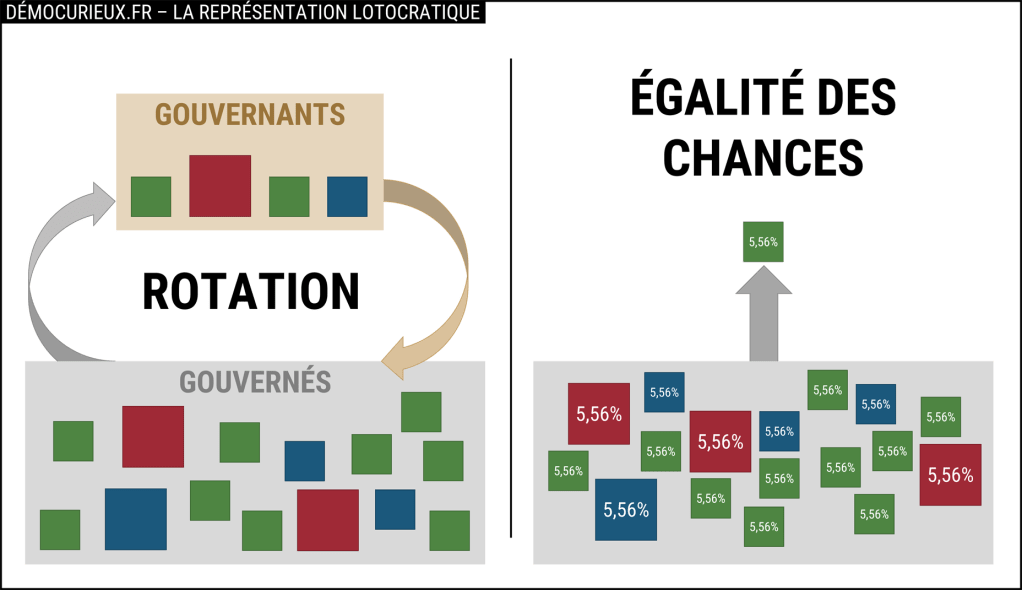 Contrairement à l’élection, le tirage au sort satisfait pleinement à la définition d’un instrument démocratique : il est à la fois égalitaire, car chaque citoyen a les mêmes chances d’être sélectionné, et inclusif, car avec suffisamment de rotations, tous les citoyens deviennent tour à tour gouvernants et gouvernés. Cela suppose cependant deux conditions : une participation obligatoire et un tirage au sort parmi une population universelle (c’est-à-dire qui n’exclut personne de droit).