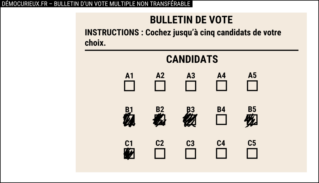 Par exemple, en reprenant les chiffres précédents, on suppose que les électeurs ne peuvent voter que pour deux candidats au maximum alors qu’il y a trois sièges en jeu. Cela pourrait donner :