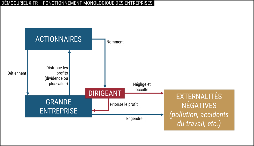 Ce fonctionnement « monologique », uniquement axé sur le profit, s’est imposé de lui-même, car suivre un seul objectif est plus simple que d’en suivre plusieurs (certains objectifs peuvent entrer en conflit, par exemple faire du profit et garantir le bien-être des salariés, ce qui nécessite de trouver un compromis). Cependant, la recherche perpétuelle du profit ne tient pas compte des externalités négatives. Les externalités négatives correspondent à toutes les conséquences néfastes qui découlent de l’activité de l’entreprise, par exemple la pollution des sols ou la dégradation de la santé des salariés.