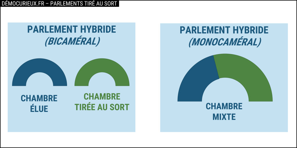 Plusieurs chercheurs en science politique ont proposé des modèles dans lesquels le tirage au sort est introduit au Parlement, souvent en remplaçant la chambre haute (le Sénat, en France) par une « chambre citoyenne ». Les pouvoirs de cette chambre varient selon les modèles, il peut s’agir soit de proposer des lois à l’autre chambre, soit d’exercer un droit de veto sur les propositions de l’autre chambre, soit les deux à la fois. Dans tous les cas, la chambre tirée au sort ne peut exercer seule le pouvoir législatif, elle doit coopérer avec la chambre élue.