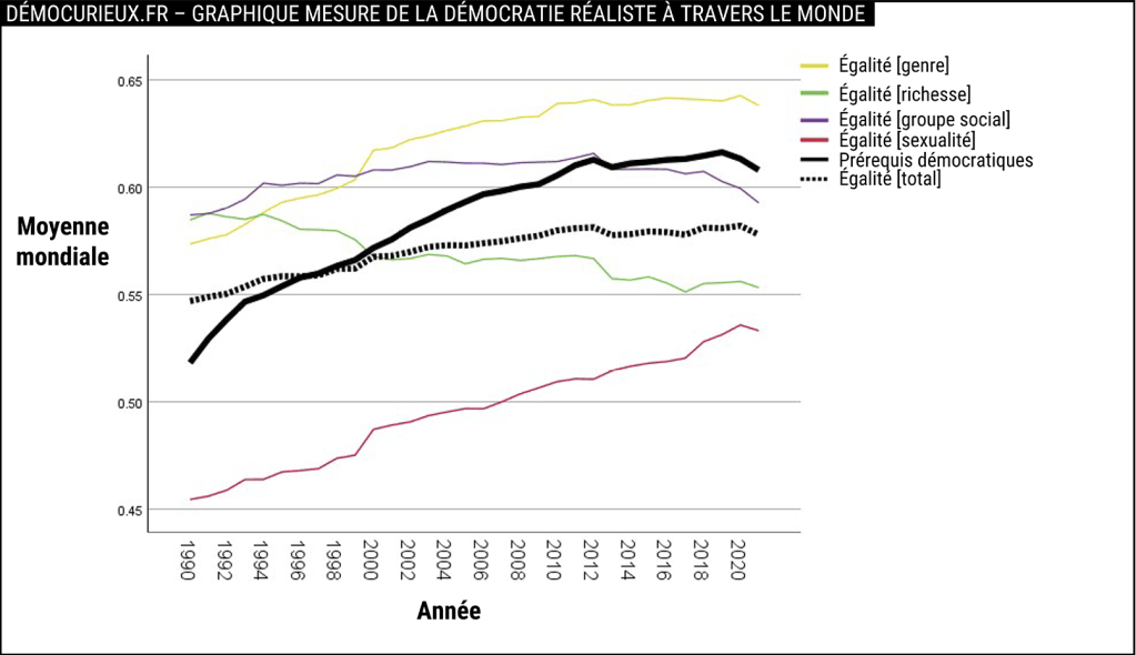 Cette distinction met en évidence une avancée démocratique mondiale ces 30 dernières années, à l’exception des inégalités de richesse qui pèsent de plus en plus dans le partage du pouvoir entre les individus. Le recul de la démocratie qui est aujourd’hui perçu par de nombreuses personnes n’est donc pas un facteur indéterminé, selon cette approche.
