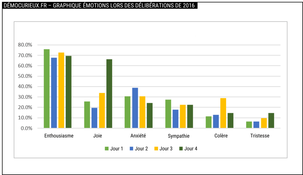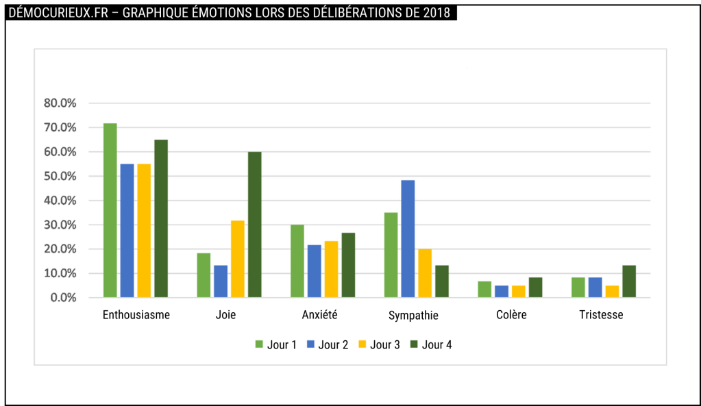 Afin d’évaluer les émotions de la vingtaine de participants, des questionnaires sont distribués à la fin de chacune des quatre journées de délibération. Il s’agit de savoir s’ils ont ressenti de la colère, de l’anxiété, de l’enthousiasme, de la joie, de la tristesse ou de la sympathie.