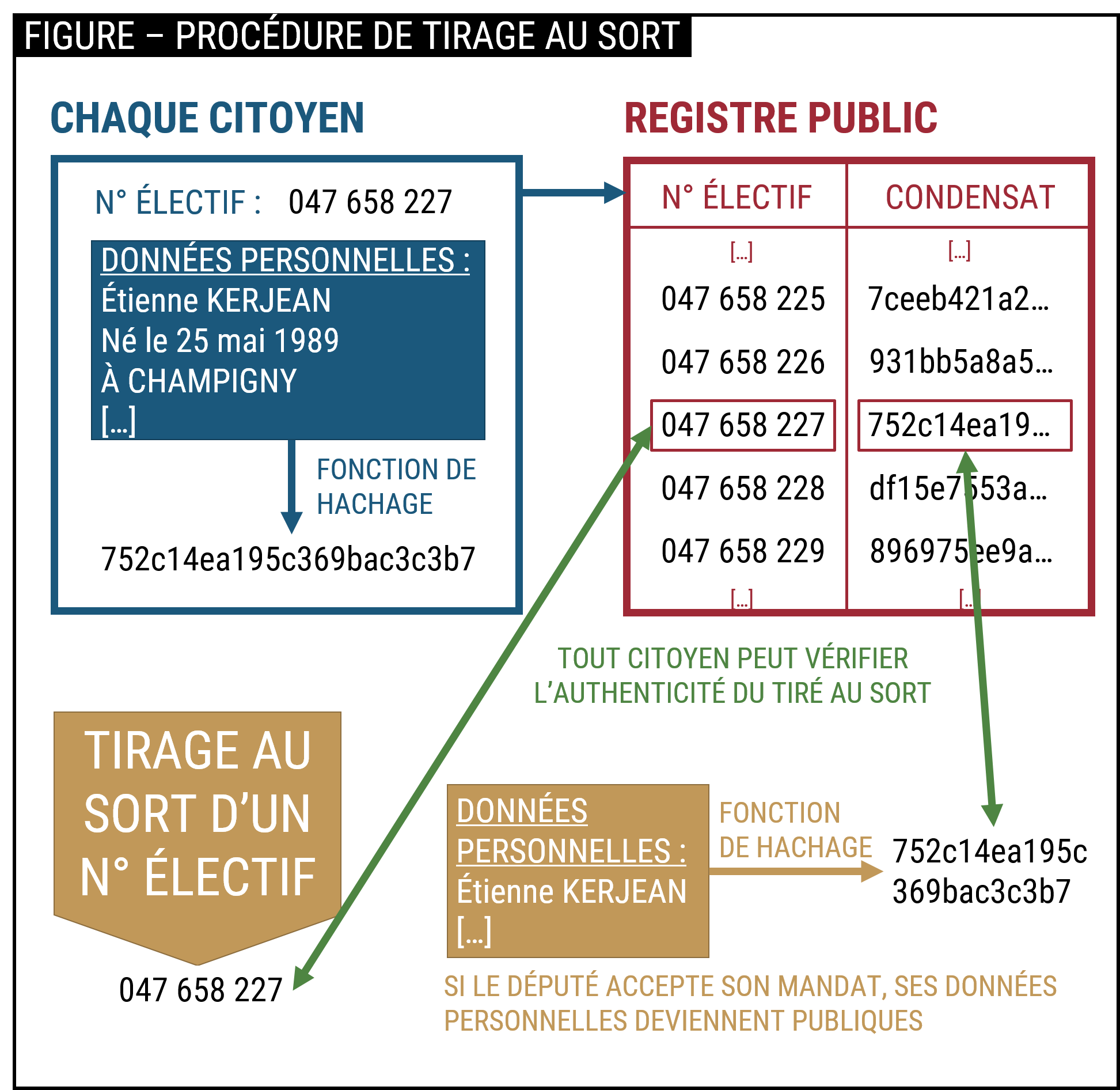 Afin de remédier à ce problème, la procédure doit se dérouler en public et avec un mécanisme physique directement observable par les citoyens. Chacun d’entre eux dispose d’un numéro électif auquel est associée un condensat. Le numéro électif est attribué par l’État lors de la majorité, et est retiré en cas de décès ou d’inéligibilité (à l’occasion d’une sanction pénale, par exemple) ; chaque numéro est unique. Le condensat est le résultat d’une fonction de hachage de plusieurs données personnelles : date et lieu de naissance, prénom, nom de naissance, etc. Un registre ouvert au public permet de consulter la liste de tous les numéros électifs et les condensats associés. Lors de la cérémonie, on tire au sort des numéros électifs (avec un système qui peut être similaire à celui utilisé pour le loto). Ainsi, les citoyens tirés au sort restent anonymes tant qu’ils n’ont pas formellement accepté leur mandat. Ultérieurement, le registre permet à n’importe qui de vérifier que le condensat associé au numéro électif de chaque député correspond bien au résultat de la fonction de hachage (les données personnelles des députés sont en effet rendues publiques).