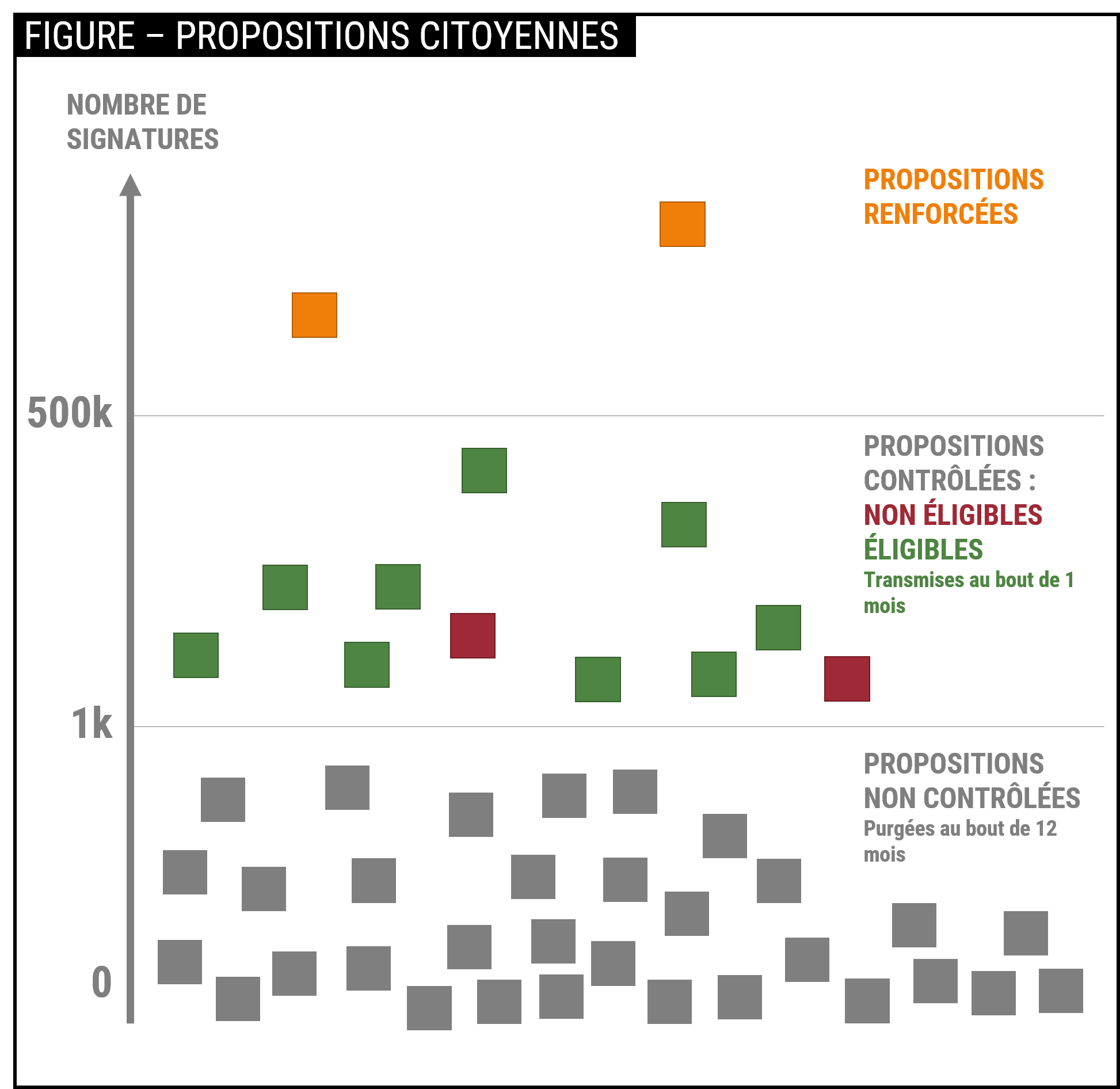 Les propositions qui ne dépassent pas les 1 000 signatures restent sur le forum citoyen pendant 12 mois avant d’être supprimées. Lorsque le seuil est atteint et que le Comité citoyen a validé la proposition, un délai d’un mois se met à courir durant lequel les autres citoyens continuent de soutenir la proposition avec leur signature. Si la proposition atteint un second seuil, par exemple 500 000 signatures, elle devient « renforcée ».