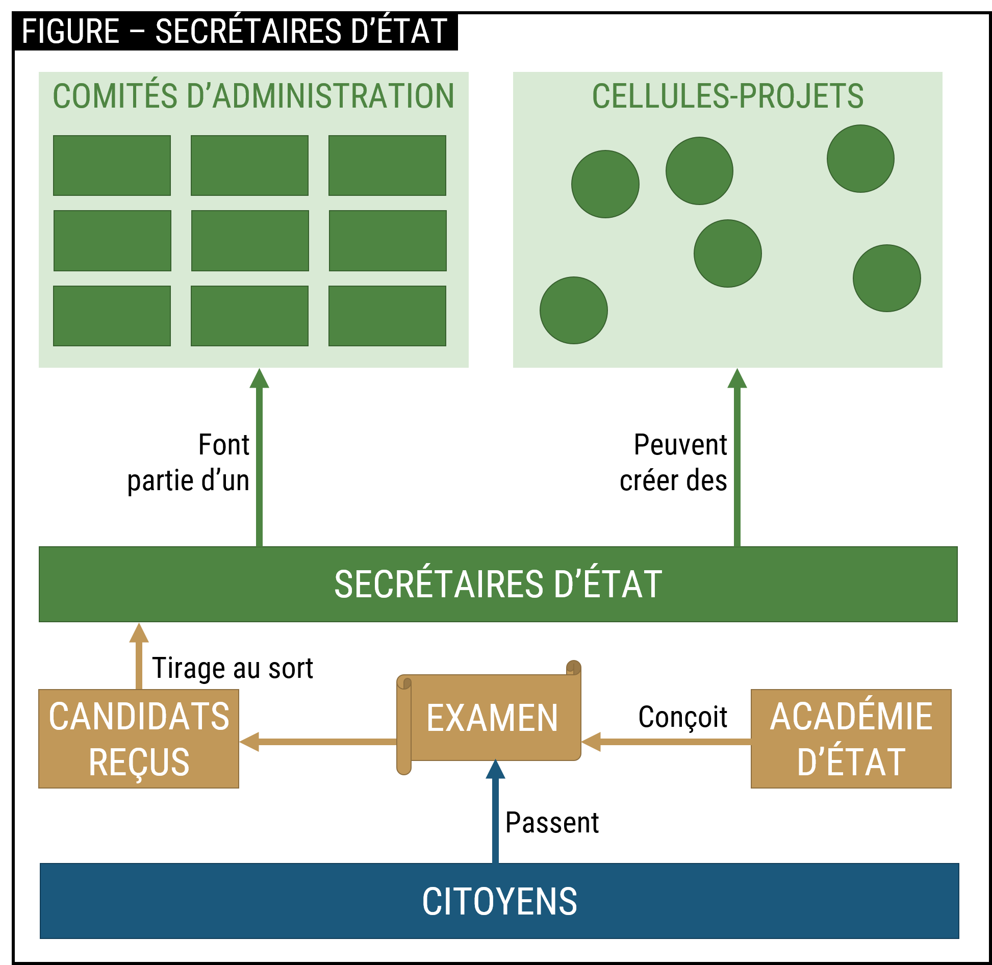 | 🏛 Composition : 20 à 100 secrétaires d’État par ministère ✋🏼 Critères d’admission : pas de casier judiciaire, pas de conflits d’intérêts 🗳 Mode de désignation : certification (examen) et tirage au sort ⌛ Durée du mandat : 10 ans | 📝 Rôles : amorcer les projets législatifs, diriger leur ministère via les Comités d’administration ♟ Pouvoirs : créer des cellules-projet, convoquer une assemblée ad hoc, adopter les règlements, nommer et révoquer les hauts fonctionnaires de leur Administration | 👋🏼 Démission : possible à tout moment 👉🏼 Révocation : en cas d’enfreinte du règlement intérieur, ou par un jury sénatorial ❌ Dissolution : impossible |